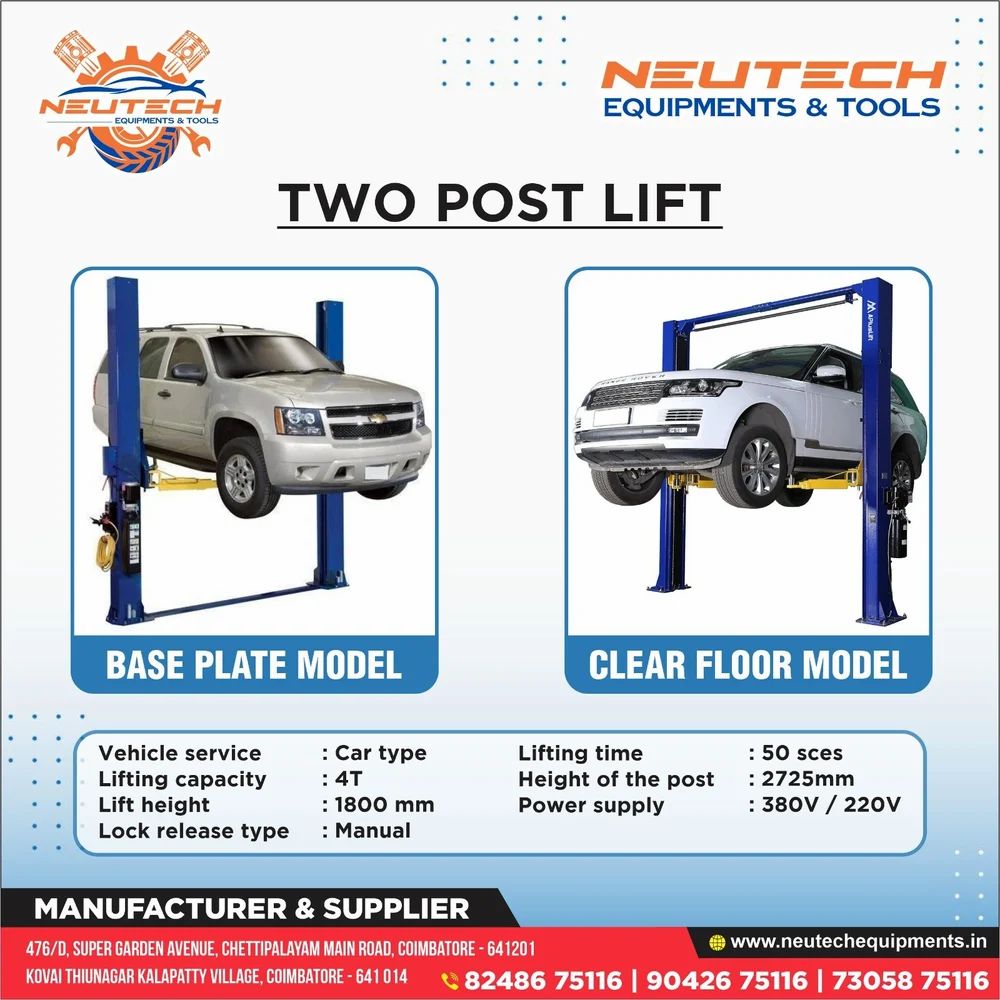 Neutech Equipments & Tools manufacturer and Wholesaler of wheel balancer, tyre changer machine, vehicle lift, alignment machine, air compressor & hydraulic jack in Coimbatore Tamil Nadu.